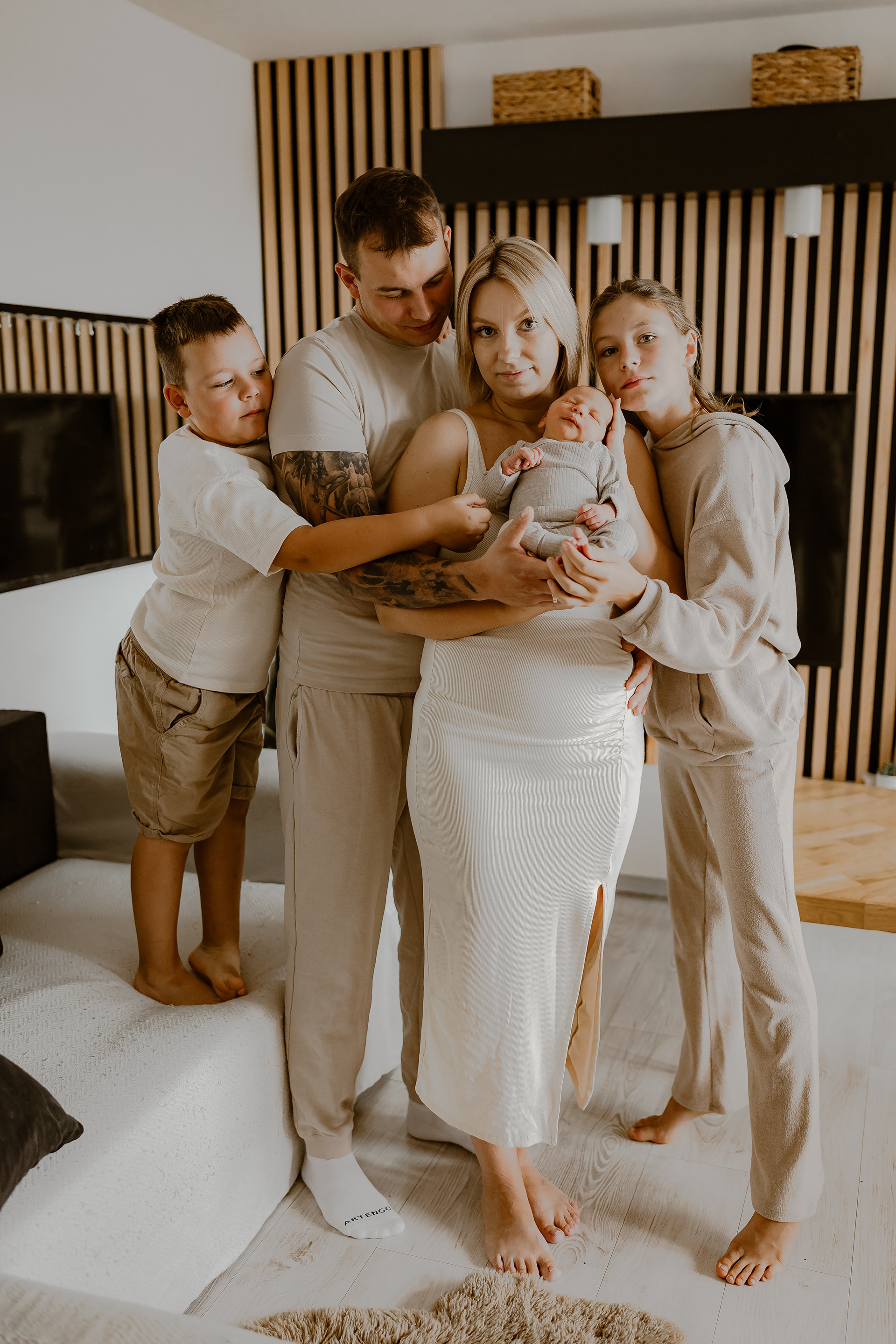 Podczas ustalania szczegółów wysyłam przykładowe stylizacje. Najlepiej żeby były to rzeczy luźne, wygodne dla mamy. Kolorystycznie dopasowujemy się między sobą z tatą i dziećmi.